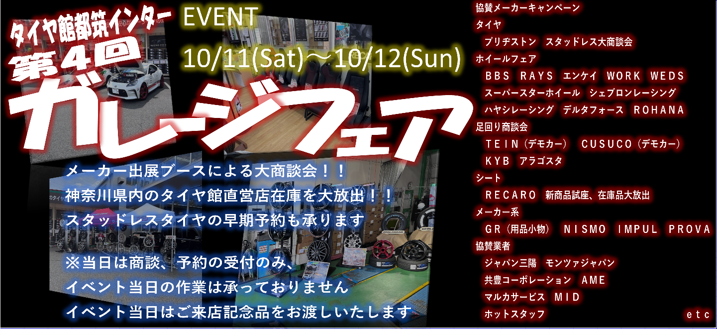 今週末10/11(土)~10/12(日)にタイヤ館 都筑インター店にて開催される第4回ガレージフェアに出展いたします。 弊社ではグッズ販売のほか、ホイールとエアロをイベント特別価格で販売予定です。 有名メーカーも多数出展予定で、デモカーの展示も予定しており、にぎやかな一日になりそうです。 日産車のカスタムをご検討の方はこの機会をお見逃しなく! ご来店お待ちしております。
